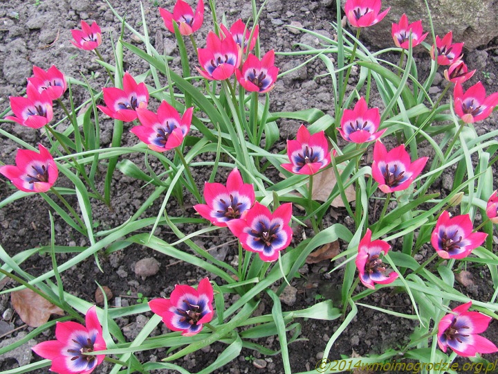 Tulipa humilis f. pulchela jest formą Tulipa humilis, a nie samodzielnym gatunkiem czy też nazwą synonimiczną – jak to często spotyka się w opisach rynkowych. Występuje w środowisku naturalnym na podgórskich terenach Iranu i Turcji. Liście zielone i lancetowate, wyprostowane, górują zazwyczaj nad ciemnoróżowymi kwiatami. Te otwarte, w kształcie gwiazdy z dobrze widoczną niebieską podstawą płatków, otoczoną białym marginesem. Forma poza słonecznym stanowiskiem, niewymagająca a bardzo wdzięczna w uprawie. Ładnie też przyrasta o nowe cebule, na zdjęciach pięcioletnie stanowisko, na którym były raz rozsadzane. Tę czynność warto wykonywać w trzecim lub czwartym roku, aby poszerzyć miejsce uprawy. Potem pozostawiamy i nie niepokoimy tulipana przez dobrych klika lat, aby się ładnie zagęścił...