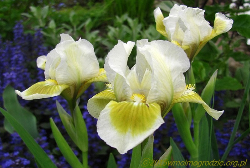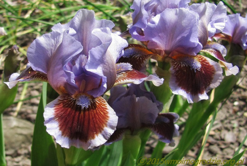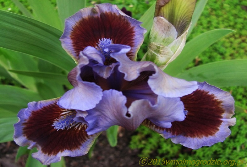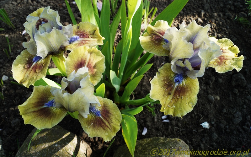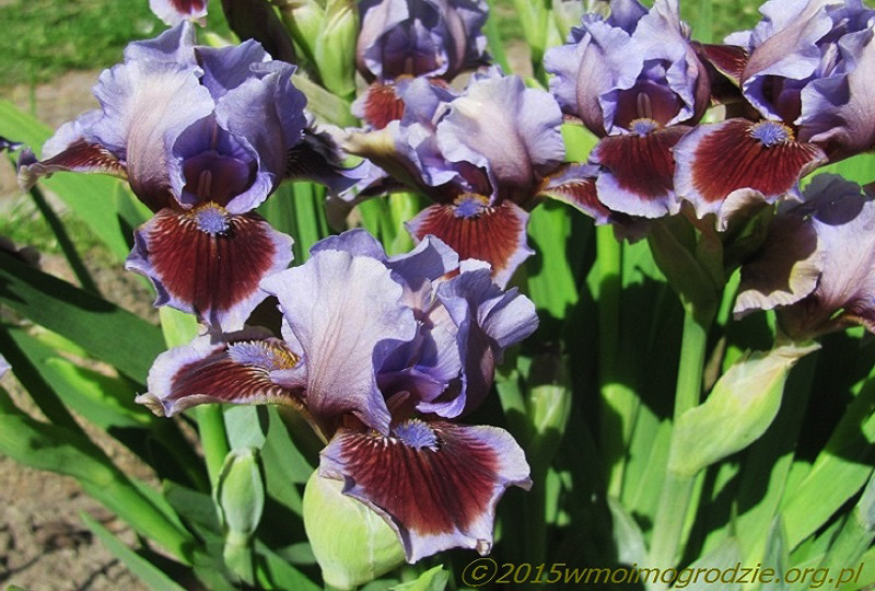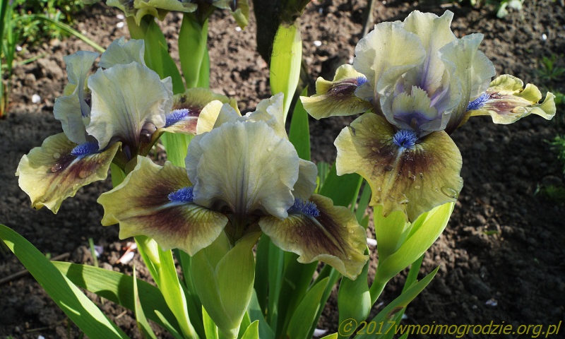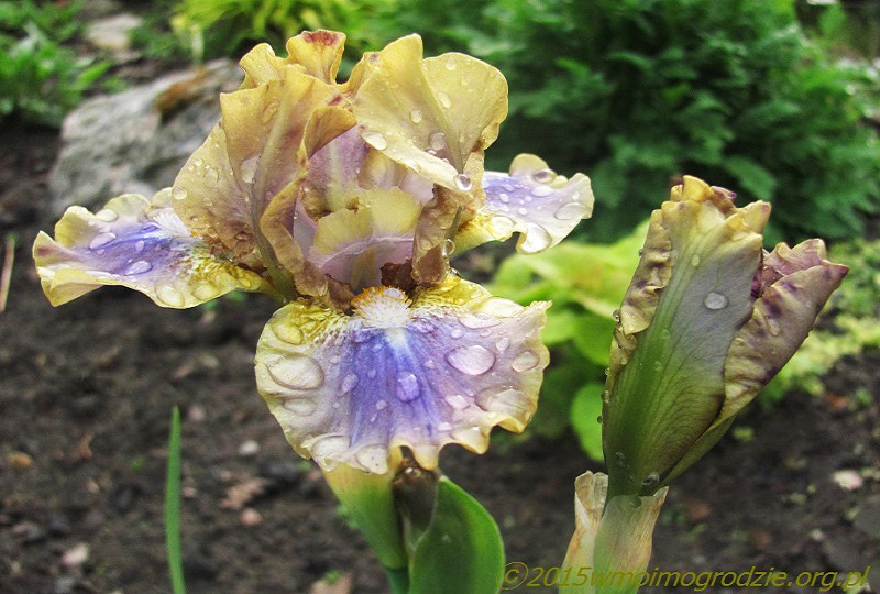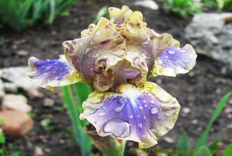 "Island" to irys z 2006 roku, znanego hodowcy Paula Blacka, autora kilku prezentowanych przeze mnie odmian. Ten, podobnie niezwykle udany, z mnóstwem kolorów i zdobień. Spróbujmy je wymienić – góra fioletowa z niebieskimi odcieniami, żebrowanie fioletowo-brązowawe, wnętrze z różanymi smugami, podstawa brązowa z płomieniami w kolorze starego złota. Dalej, dół to płatki falowane w kolorze kasztanów, z fioletowym marginesem i białymi strzałkami, broda niebieska przetykana złotym włosem. Jakby tego wszystkiego było mało, to kwiaty wydzielają lekki piżmowy zapach. Irys dorasta do 36 cm, na pędzie po 5 pąków kwiatowych. Nic mi nie wiadomo o nagrodach, ale z taką urodą to i bez nich irys wzbudza entuzjazm...