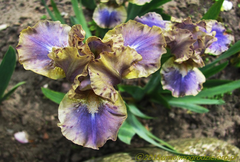 Na pierwsze kwiaty "Leopard Print" (Thomas Johnson, R. 2006) przyszło mi czekać dwa lata. Niemniej, warto było... kolor bazowy płatków, na którym pojawiają się nieregularne plamy, jest równie niezwykły co i trudny do zdefiniowania. Coś pośredniego pomiędzy ecri w dość ciemnym odcieniu, oliwką i kolorem sawanny latem. Podążając dalej typ tropem – leopardzie cętki są purpurowe i fioletowe, ramiona góry różowe, żebrowanie turkusowe, podstawa płatków oliwkowa ze złotym haftem. Dół poza pofalowanym marginesem niebiesko-fioletowy. Kwiaty pachną słodkimi owocowymi nutami. Wzrost do 36 cm. Nagrody – Honorable Mention 2006 i Award of Garden Merit 2011. Irys jak żaden inny...