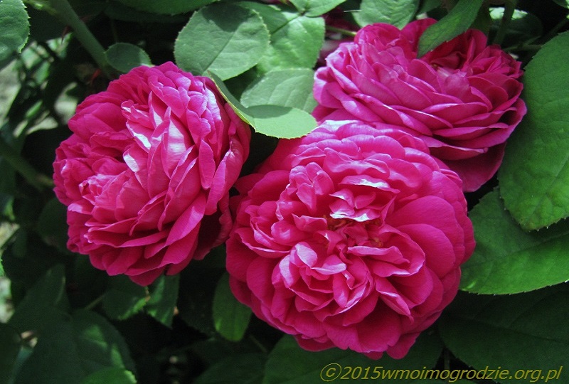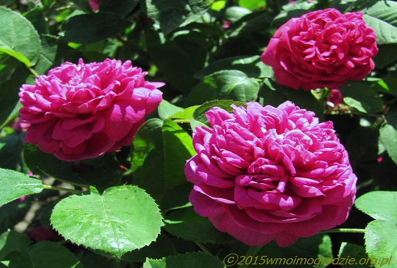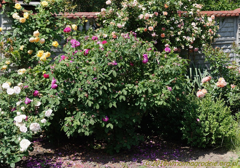 To jest róża, którą z czystym sercem mogę każdemu polecić. Moja 7 letnia ma około 1,6-1,7 m wysokości a ponieważ rosną koło niej trzy inne, to szerokość to ok. 1,2, 1,4 m. Ma zwarty bardzo ładny pokrój, nawet bez większych zabiegów. Pierwsze kwitnienie jest najmocniejsze (w czerwcu) ale po krótkiej przerwie, nawet jeśli jej nie przytniemy, to zaczyna systematycznie kwitnąc znowu. Wtedy kwiatów jest mniej, ale dość aby zachwycić. Właśnie przed chwilą na nią spojrzałem, bardzo to pięknie wygląda. Może nawet bardziej podoba mi się właśnie w okresie tego kolejnego, tych kolejnych kwitnień. Wiśniowo malinowy kolor kwiatow, piękny zapach starodawnych róż. Poza tym jest niezwykle zdrowa! !!