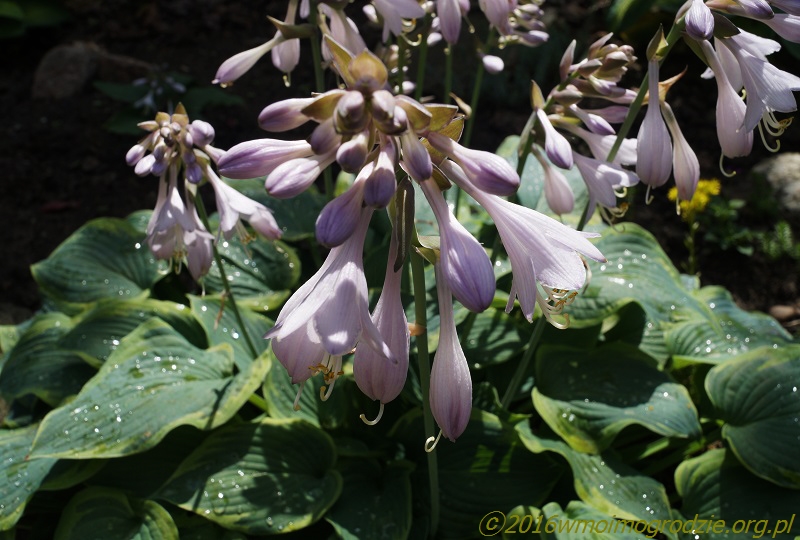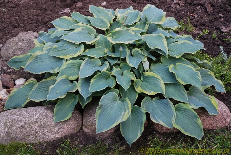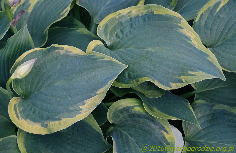 Kolor centrum liści stalowoniebieski i im starsza hosta tym pełniejszy, u młodych roślin wybarwienie jest niebiesko-zielone. Po nim następuje cienka biała linia przypominająca błyskawicę, pojawiająca się późnym latem i dalej nieregularny żółto-zielony pofalowany margines. Liście w kształcie serca są duże, o wymiarach 16.5 cm x 11 cm, nieproporcjonalne do wysokości hosty – zdjęcie z 14 czerwca...