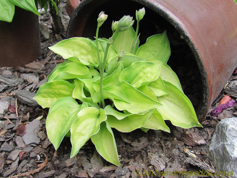 Hosta "Faithful Heart" została wyhodowana przez hybrydizera Kirka Brilla z Des Moines (Iowa, USA). Rejestracja hodowcy w 1999 roku. Jest sportem bardzo popularnej wśród Minis "Cheatin Heart". Liście odmiany są owalnie sercowate, z delikatnie falowanym brzegiem, o wymiarach 6.4 cm x 5.1 cm. Młode żółte z szerokim zielonym marginesem. Wraz z wiekiem margines staje się węższy i jaśniejszy, centrum poszerza się i zmienia kolor na kremowo-jasnożółty. W moim ogrodzie "Faithful Heart" w czwartym roku uprawy, 19 czerwca 2015 roku...