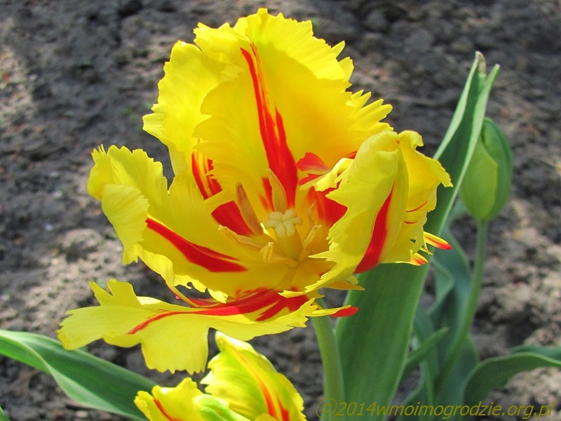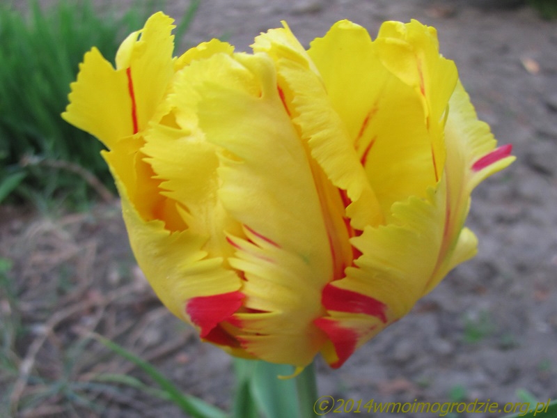 Kolejny stały bywalec w kwiaciarniach i na wystawach – tulipan "Flaming Parrot" (P.Heemskerk, C.A.Verdigaal, 1968), sport "Red Parrot". Kwiaty początkowo zielone i żółte, z wiekiem złote z ciekawym rysunkiem czerwonych płomieni. Mocne, tropikalne zestawienie barw. Płatki o mocnej fakturze sprawiają, że kwitnie bardzo długo i jest też jednym z ostatnich kwitnących tulipanów...