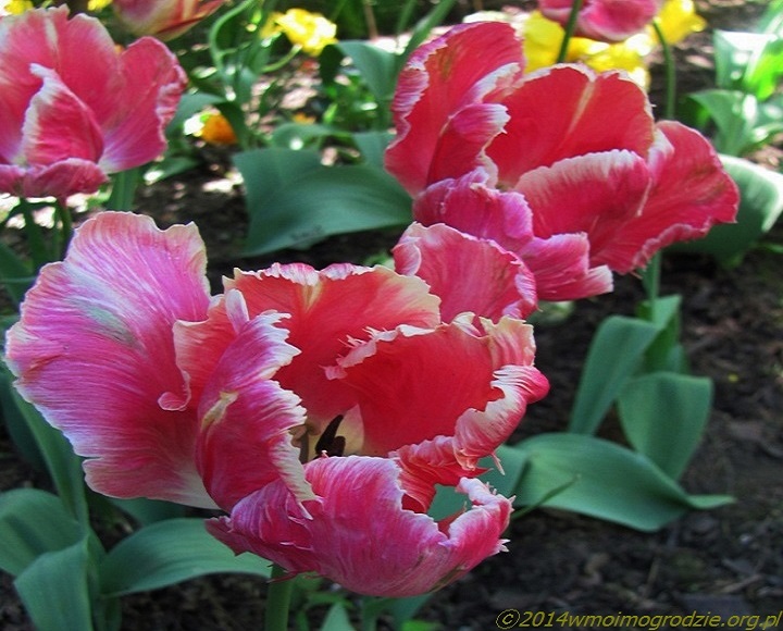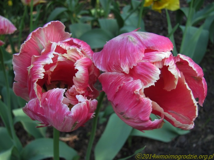 Tulipan "Master Parrot" (De Geus-Vriend, 1993). Wysoki, dorasta do 50 cm, niemniej o wystarczająco silnej łodydze, aby utrzymać bardzo duże kwiaty. Różowy, z białą falbanką i zielonymi znaczeniami. Kwitnie w drugiej połowie maja, ponad dwa tygodnie. Ładny i rzadko spotykany...