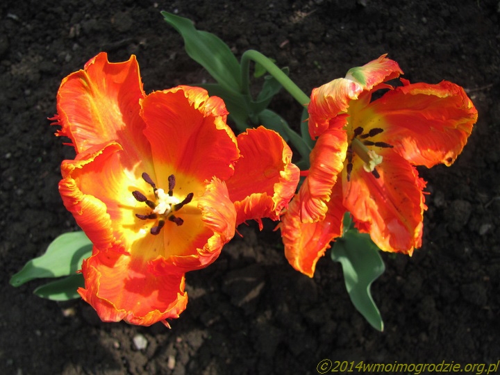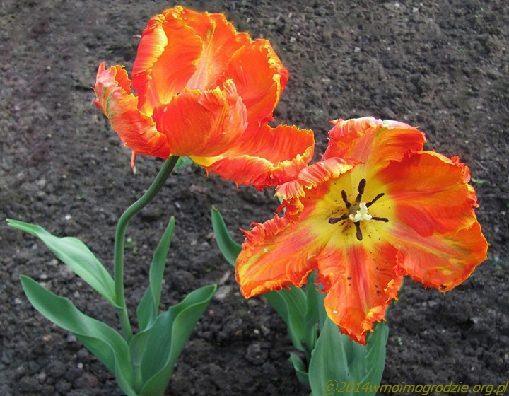 Tulipan "Parrot King" zasługuje jak najbardziej na swoją nazwę. Królewski w kolorze pomarańczowym i żółtym, z zielonymi smugami na zewnątrz młodych kwiatów. Brzegi płatków mocno pocięte i drapowane. Kwiaty bardzo duże, średnicy ponad 12 cm. Pędy mocne, do 50 cm, przy deszczowej pogodzie mogą się pokładać, odzyskując wyprostowany pokrój jak tylko pozbędą się nadmiaru wilgoci. Wspaniały tulipan, ale noszenie takiej nazwy i zobowiązuje do sprawiania iście królewskiego wrażenia...