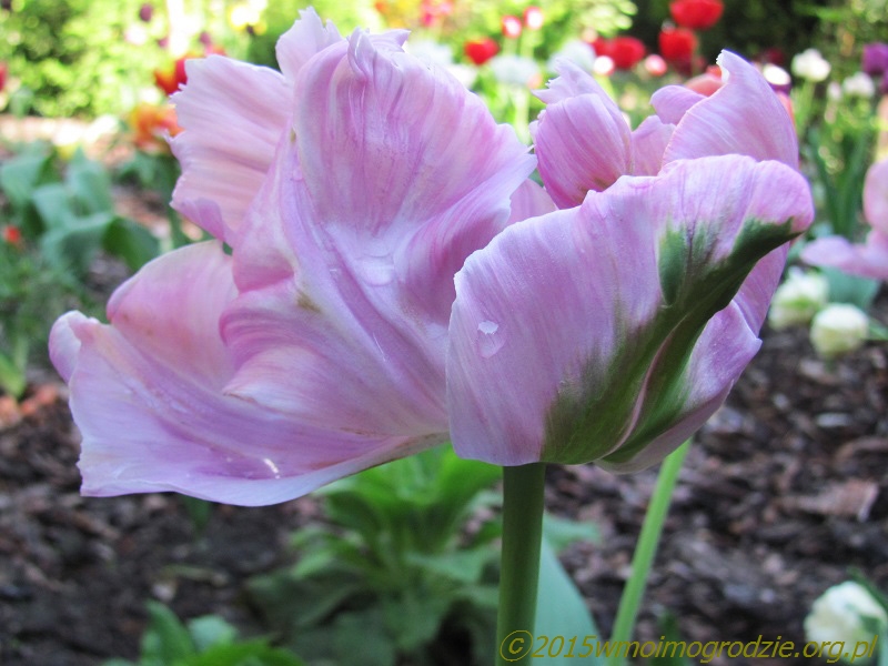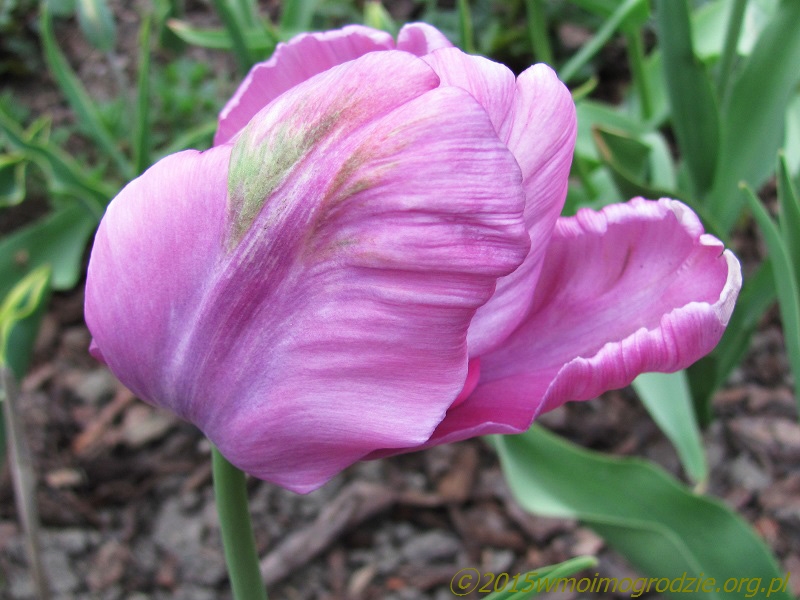 Tulipan "Rai" (Burger & Blank van Dam, 1986). Z imieniem hinduskim, ciekawy w kolorach i kształcie – kwiaty fioletowe z zielonymi akcentami, płatki mocno wywinięte i drapowane. Bardzo fotogeniczny...