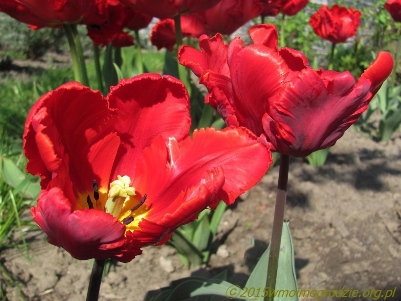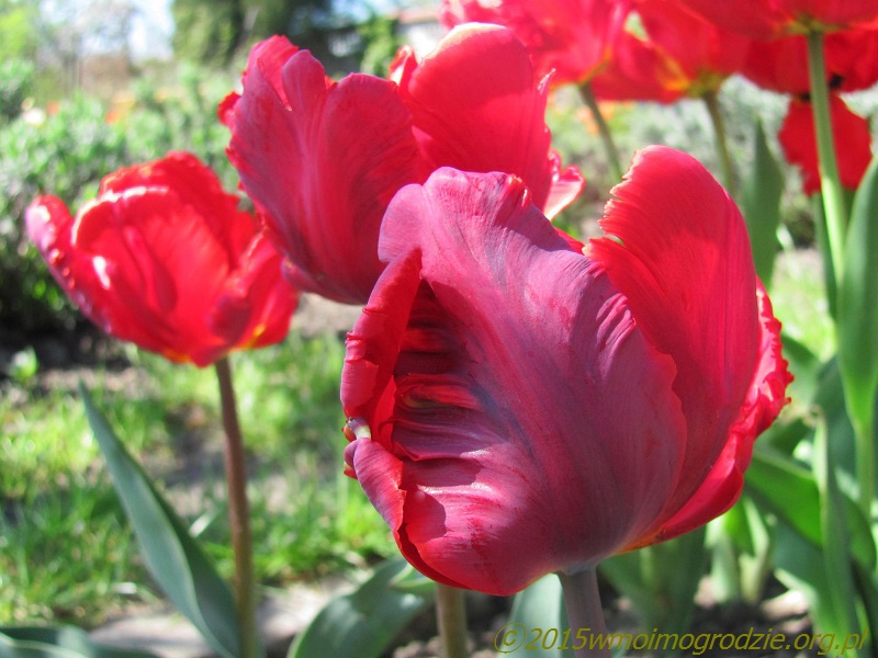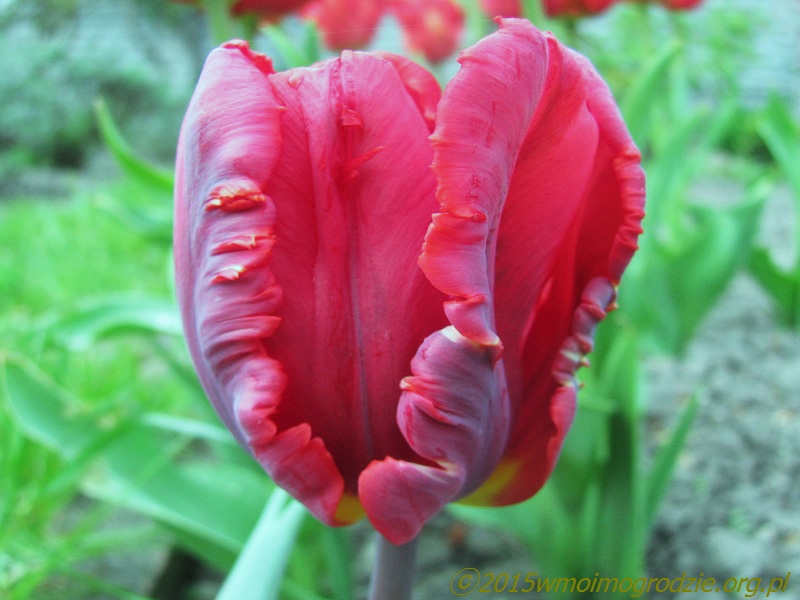 Tulipan "Rococo" (H. Slegtkamp & Co, 1942). Sport "Couleur Cardinal". Z taką datą urodzenia to już prawie tulipan historyczny. Rokokowy w kształcie i kardynalski w kolorze, czyli jak najbardziej właściwie nadane imię. Niski, do 35 cm, idealny do pojemników. Kwitnie z początkiem maja jako jeden z pierwszych papuzich. Ładnie i wyczuwalnie pachnie...