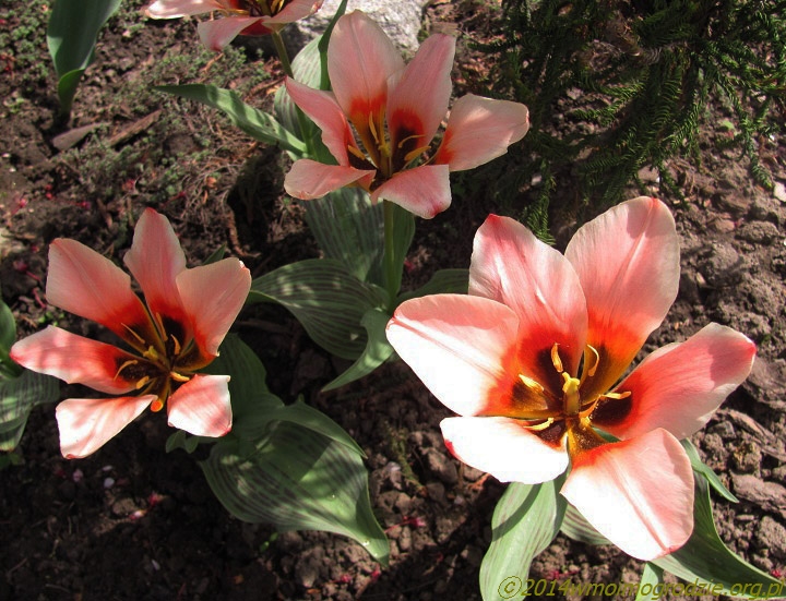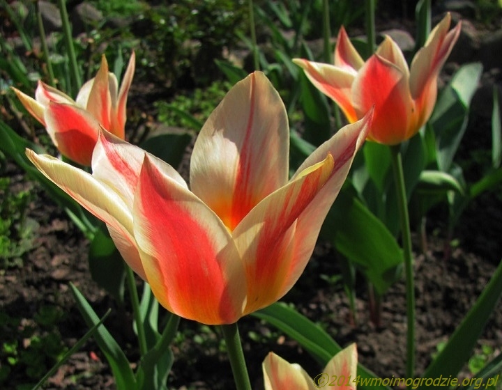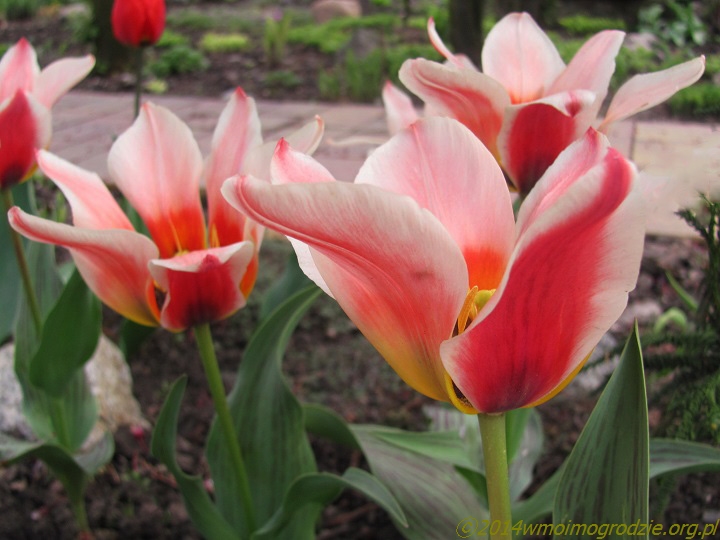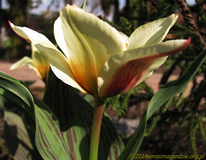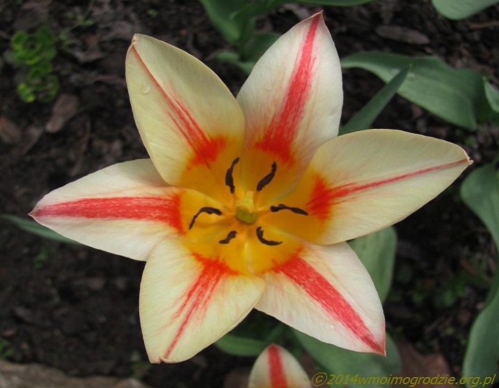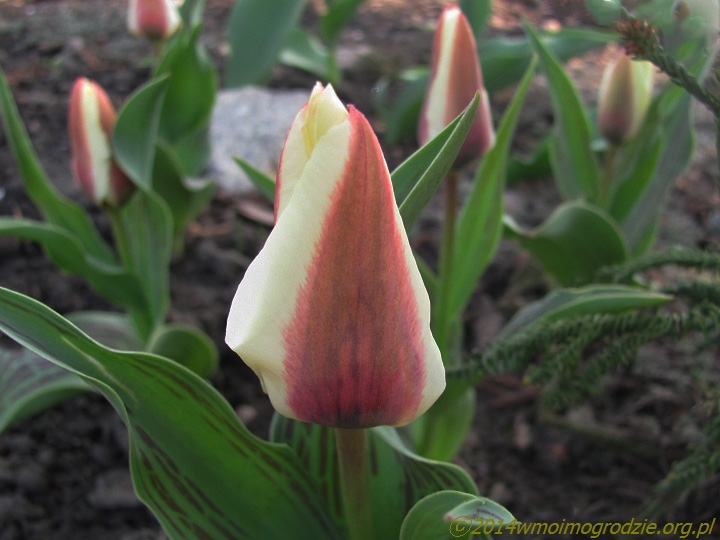 Tulipan "Addis" w tej grupie to prawdziwy old school. Wyhodowany w 1955 roku w szkółce holenderskiej A. Overdevest Gz. Nie zwraca z daleka uwagi ani kontrastem, ani też żywymi kolorami, do dostrzeżenia z bliska. Płatki kwiatów w pąkach i młodych są na zewnątrz brązowo-ciemnobordowe z zielono-granatowymi smugami i kremowym marginesem. Starsze rozwinięte z widocznym naprzemiennym wybarwieniem – jedne płatki czerwone z kremowym marginesem i brązowawa podstawą, a drugie kremowe z czerwonymi smugami. Wnętrze w kolorze kości słoniowej z czerwonymi wybarwienia na topach i żółto-czerwono-czarną bazą. Całość daje nam 8 kolorów, a więc dzieję się dużo i jest i co podziwiać. Wzrost tulipana do 35 cm, liście zdrowe, proporcjonalne, z typowymi dla Greigii upstrzeniami. Rzadko już spotykana odmiana, w moim ogrodzie...